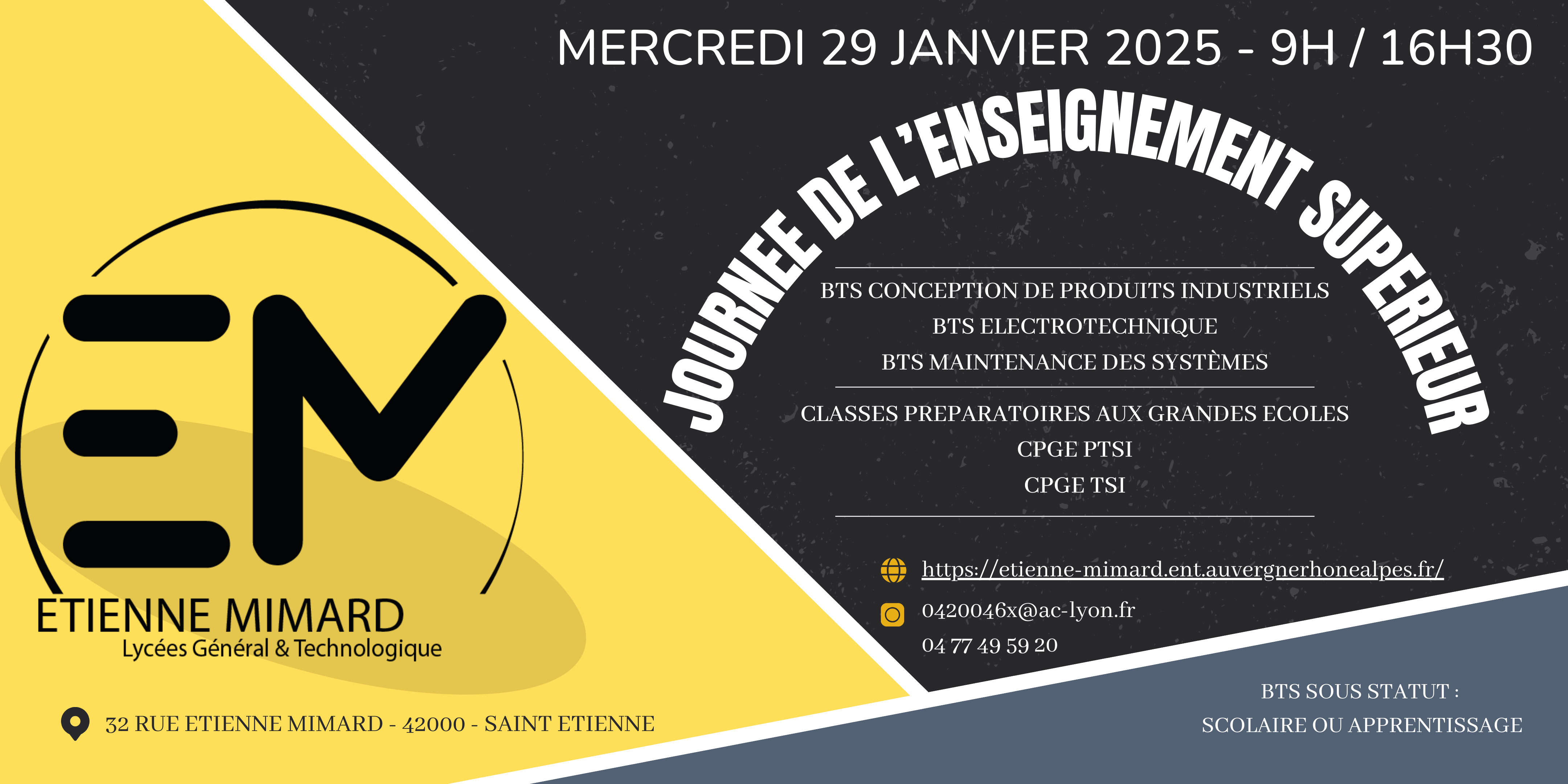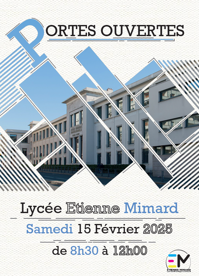Le lycée Etienne Mimard vous accueille lors de la Journée de l’Enseignement Supérieur qui aura lieu le mercredi 29 janvier 2025 de 9h à 16h30 ; et, lors de la Journée Portes Ouvertes organisée le samedi 15 février 2025 de 8h30 à 12h.
