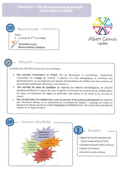 CAP Accompagnement Educatif Petite Enfance (AEPE) - Nouveauté rentrée 2025 Article mis en ligne le 4 juin 2025 par Agnès Granjon Cliquez sur le document pour consulter la fiche complète :